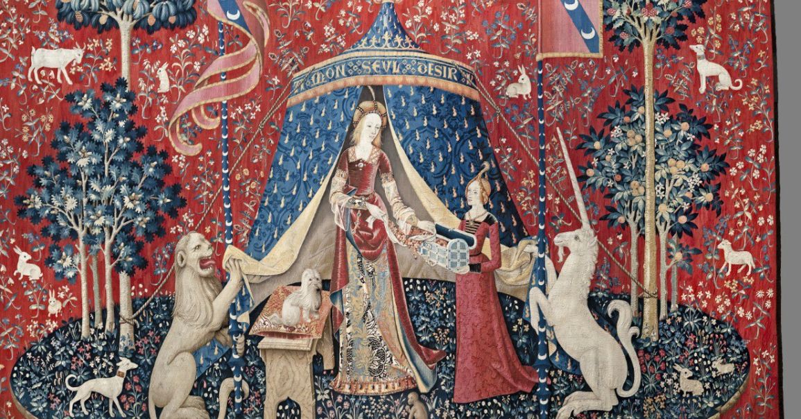 «Дама с единорогом» — серия из шести шпалер, вытканная около 1500 года, и хранящаяся в парижском музее Клюни. Что же означают загадочные сцены, так восхищающие своей красотой? Всё Средневековье очень символично: всё видимое — выражение невидимого, за внешними формами — рассказ о внутреннем мире человека. Исследователи пишут, что каждый гобелен — это аллегория одного из пяти органов чувств. О каком загадочном чувстве повествует шестой гобелен, на котором выткана фраза «Моё единственное желание»?